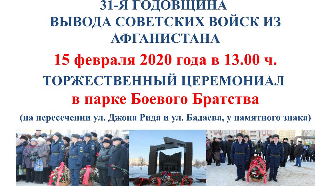 Просим разместить информацию о торжественном церемониале, посвященном 31-й годовщине вывода советских войск из Афганистана, который состоится 15.02.2020 в 13.00 в Парке Боевого Братства (на пересечении ул. Джона Рида и ул. Бадаева, у памятного знака), на официальных информационных ресурсах учреждений в сети Интернет, а также информационных стендах (афиша во вложении).