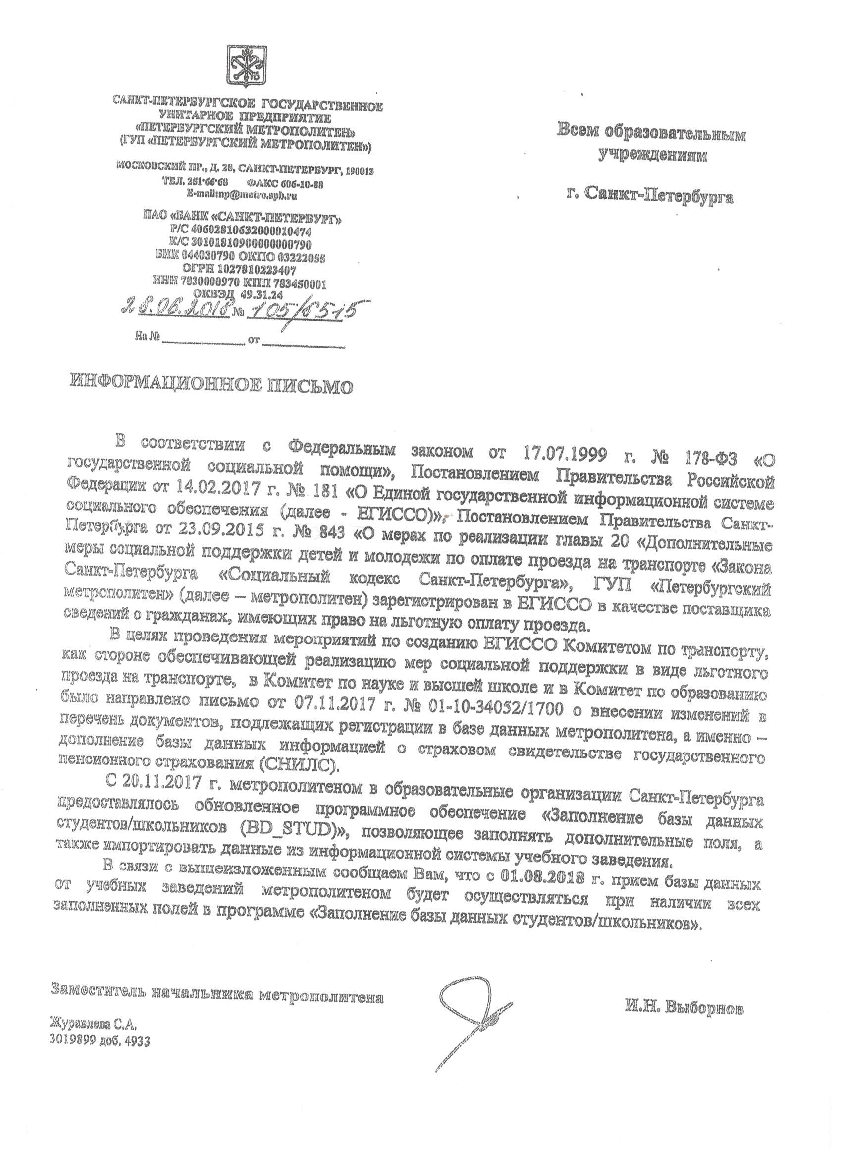 В прикрепленном файле информационное письмо СПб ГУП "Петербургский метрополитен" от 28.06.2018 №105/6515.